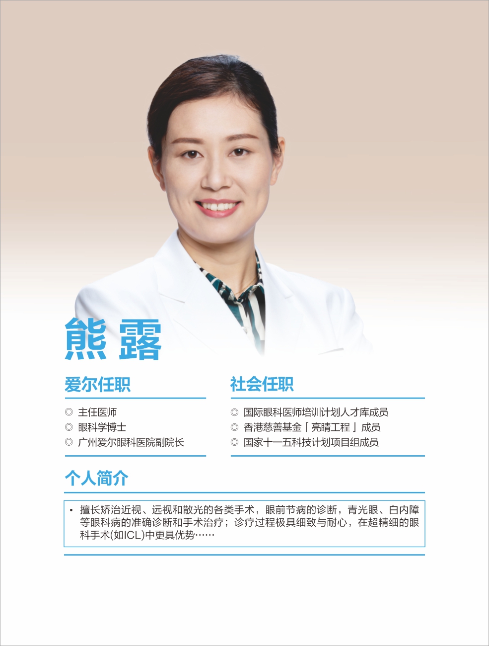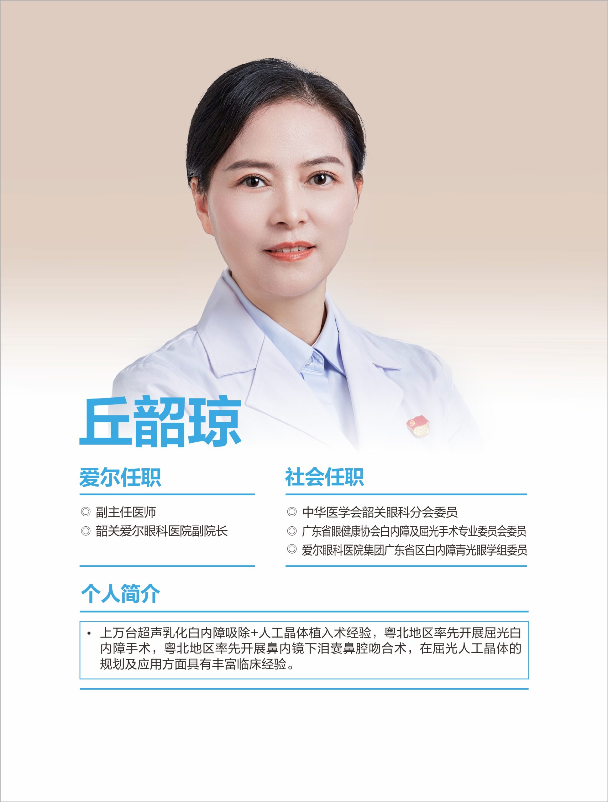 韶關(guān)愛(ài)爾眼科醫(yī)院有限公司白內(nèi)障團(tuán)隊(duì)擁王愛(ài)琴院長(zhǎng)(愛(ài)爾眼科粵北區(qū))、丘韶瓊院長(zhǎng)、郭俊豪主任等多位專科醫(yī)生,具備同步國(guó)際的白內(nèi)障手術(shù)能力,能熟練開展各項(xiàng)常規(guī)及疑難白內(nèi)障手術(shù)。 可開展微切口煥晶白內(nèi)障手術(shù),植入多焦晶體或多焦+散光矯正晶體,在治療白內(nèi)障同時(shí)同步解決遠(yuǎn)視/近視、老花眼、角膜散光等屈光問(wèn)題,醫(yī)生手術(shù)經(jīng)驗(yàn)豐富,為眾多患者帶來(lái)更舒適的視覺(jué)。